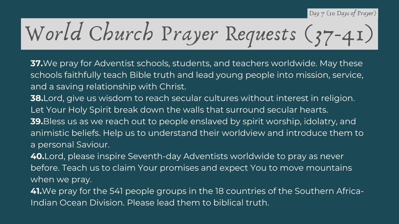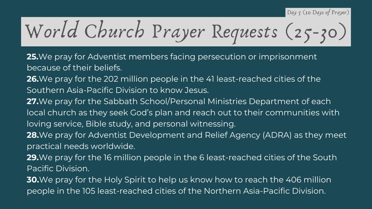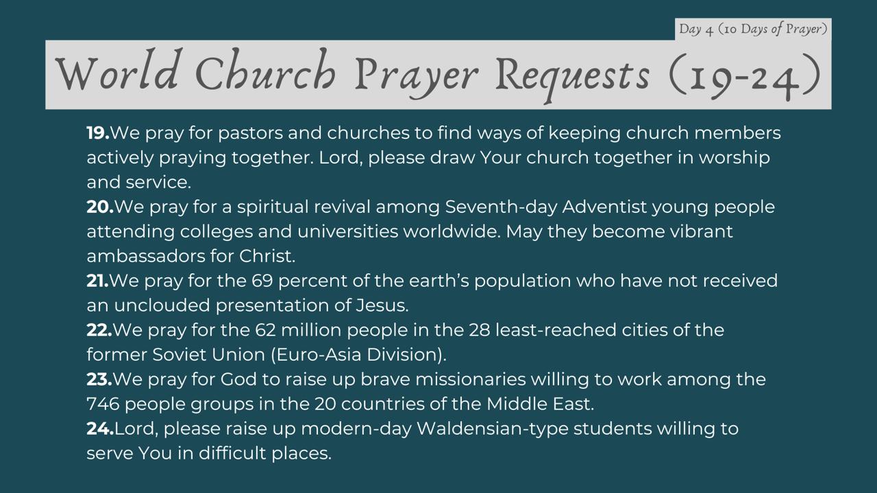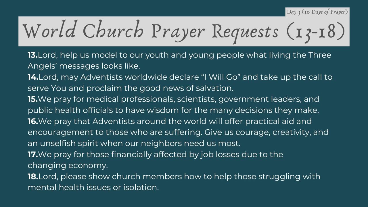 | Date | Topic | 54 Global Prayer Requests |